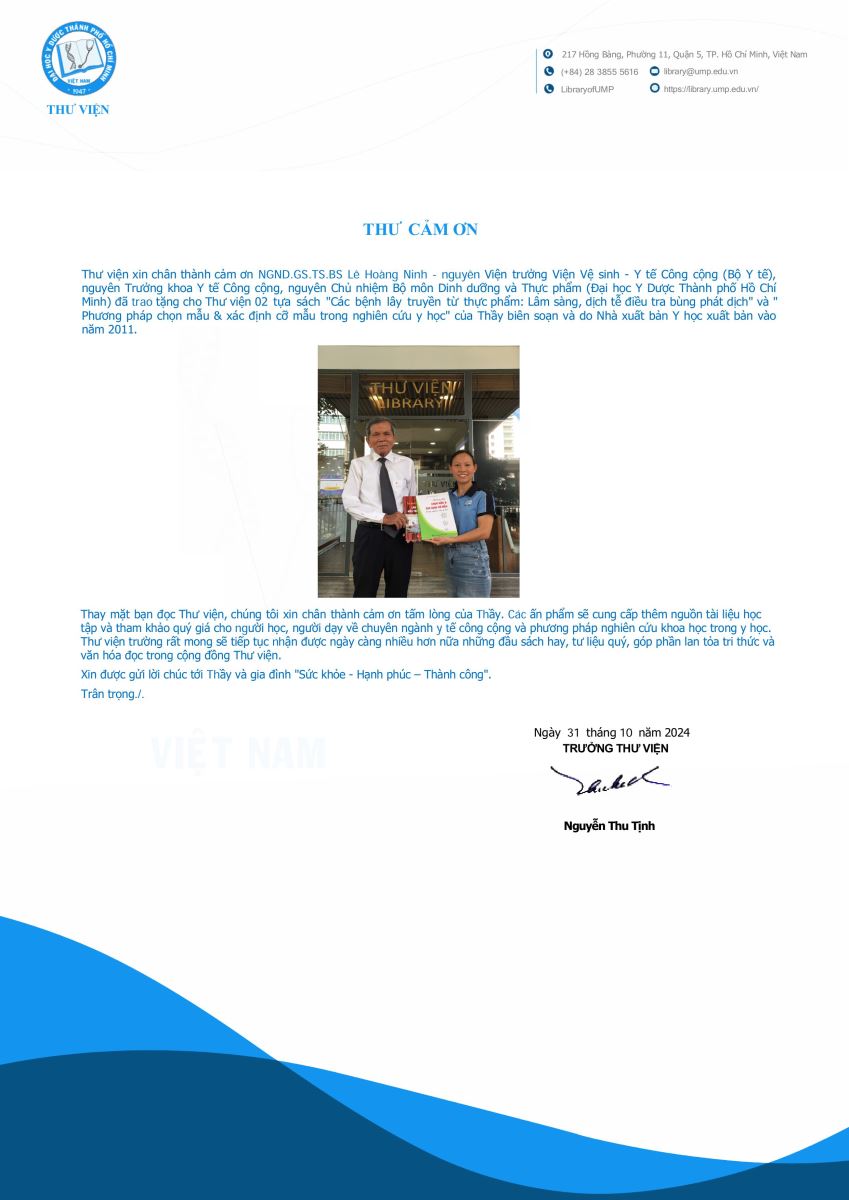 Thư cảm ơn các cá nhân, tổ chức đã tặng sách cho Thư viện Đại học Y Dược Thành phố Hồ Chí Minh - Tháng 10/2024