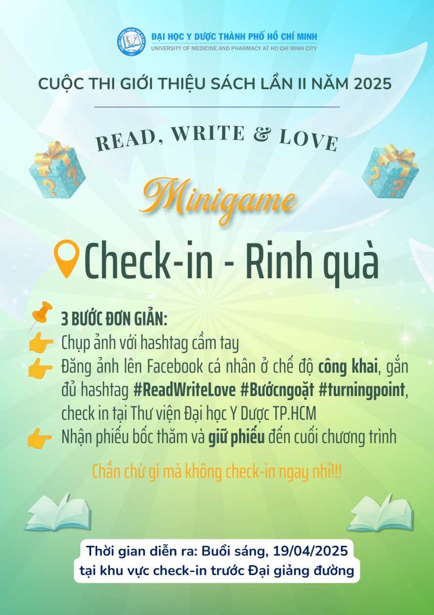 - Đăng Facebook cá nhân, để ở chế độ công khai và gắn đủ hashtag #ReadWriteLove #Bướcngoặt #turningpoint, check-in tại Thư viện Đại học Y Dược TP.HCM.